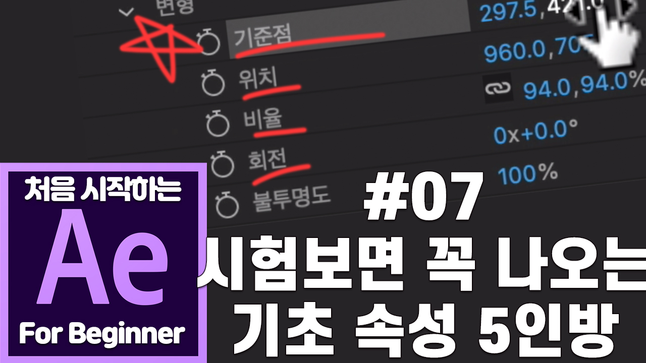 애프터이펙트 기초 강좌 07강 시험보면 꼭 나오는 기초 속성 5인방 - 포지션,스케일,회전,기준점,불투명도