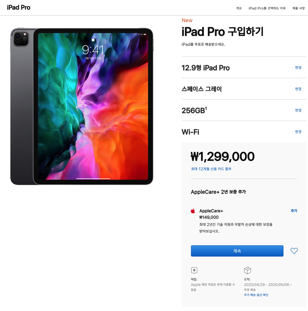 아이패드 프로 4세대 기본 저장 용량이 128기가부터 시작하며 최대 1테라까지 확장은 가능합니다만 저장 용량이 커지는 만큼 지출도 커지게 되죠 😅 개인적으로 아이폰X 256기가로 쓰면서 용량에 큰 불편함도 없고 구글 드라이브나 아이클라우드 용량이 있어서 256기가로 선택했습니다.