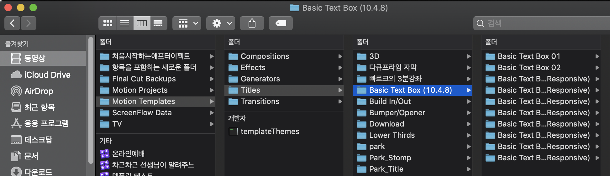 2. [동영상] - [Motion Templates] - [Titles] 폴더 내에 [Basic Text Box(10.4)] 폴더를 옮기시면 됩니다.