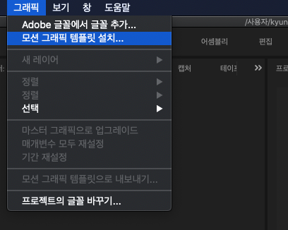 - 프리미어 프로를 실행하고, 상단 메뉴에서 [그래픽] > [모션 그래픽 템플릿 설치]를 선택합니다.