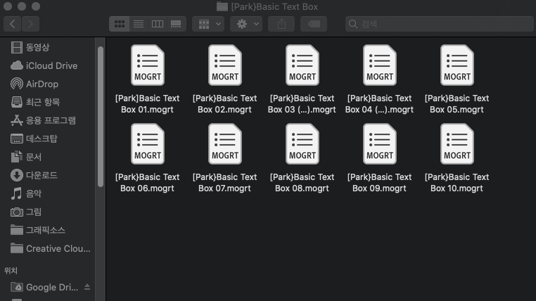 파인더(Finder)나 윈도우즈 탐색기에서 mogrt 파일을 다중 선택한 후 필수 그래픽 패널로 드래그하여 설치하는 방법도 있습니다.