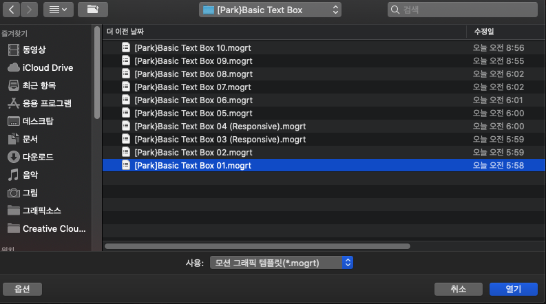 - MOGRT 파일을 선택하고 [열기]를 클릭하여 설치합니다.