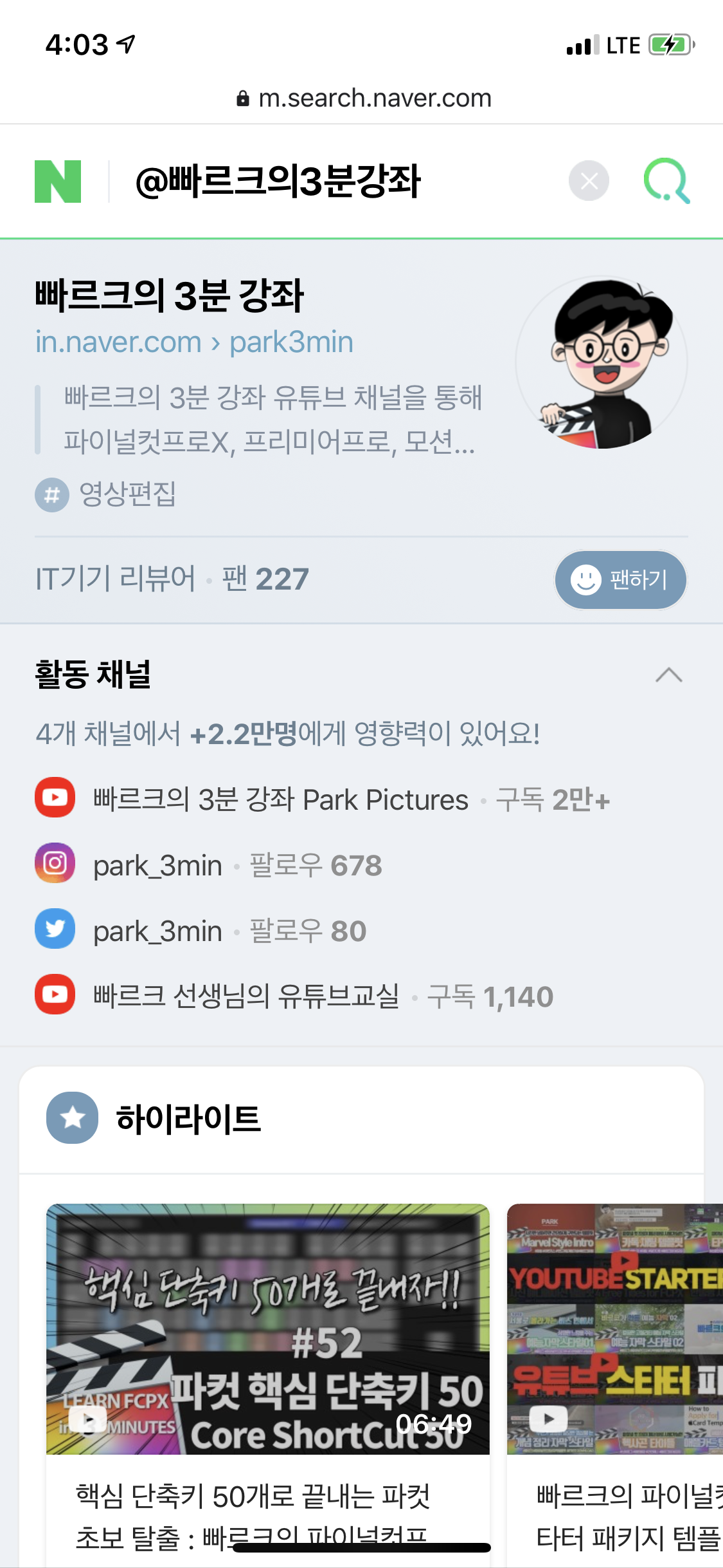 모바일로 네이버 검색창에 "@빠르크의3분강좌"를 검색해보시면 다음과 같이 저의 콘텐츠들을 한 번에 보실 수 있습니다.