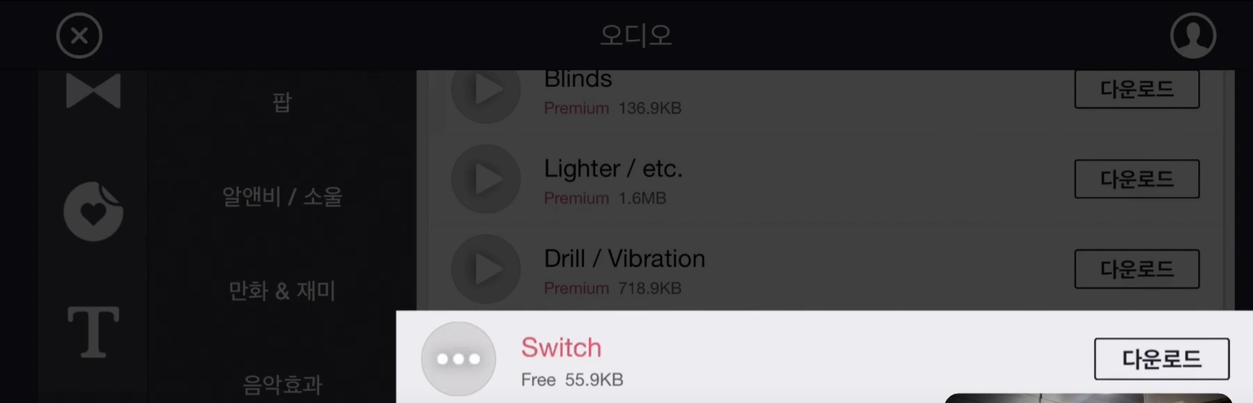키네마스터는 자체 에셋스토어를 활용하여 음악, 효과음 등을 쉽게 듣고 다운로드 받을 수 있게 하였습니다.