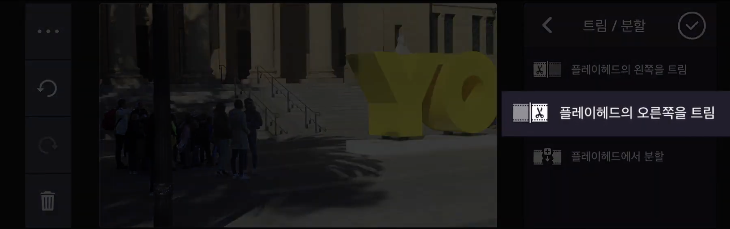 [트림/분할]을 선택하신 다음 [플레이헤드의 오른쪽을 트림] 을 선택하면 쉽게 음악의 길이와 영상의 길이를 맞출 수 있습니다.