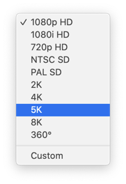 ④ Video – Format(비디오-포맷): 영상의 주요 포맷을 설정합니다. 풀HD 1080p와 4K 및 8K 포맷까지 지원합니다. 사용자가 임의의 크기를 지정하고자 할 때는 Custom을 설정합니다.