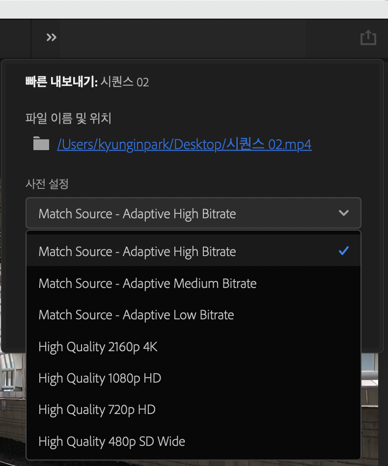 프리미어프로의 새로운 기능 [빠른내보내기] 기능을 통해 작업 워크플로우가 간소화 된 느낌입니다.