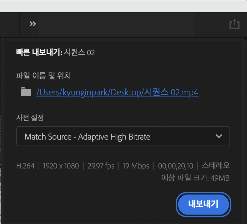 프리미어프로에서 간편하게 mp4 파일로 출력하는 빠른내보내기 기능