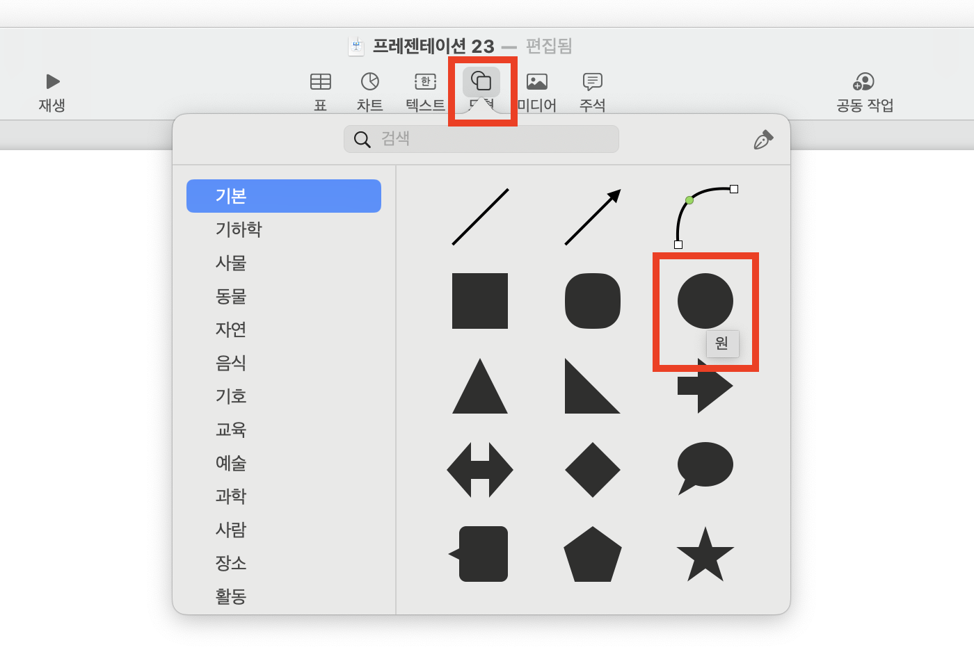 상단 메뉴 아이콘 중 [도형]을 클릭한 뒤 [원]을 선택합니다.