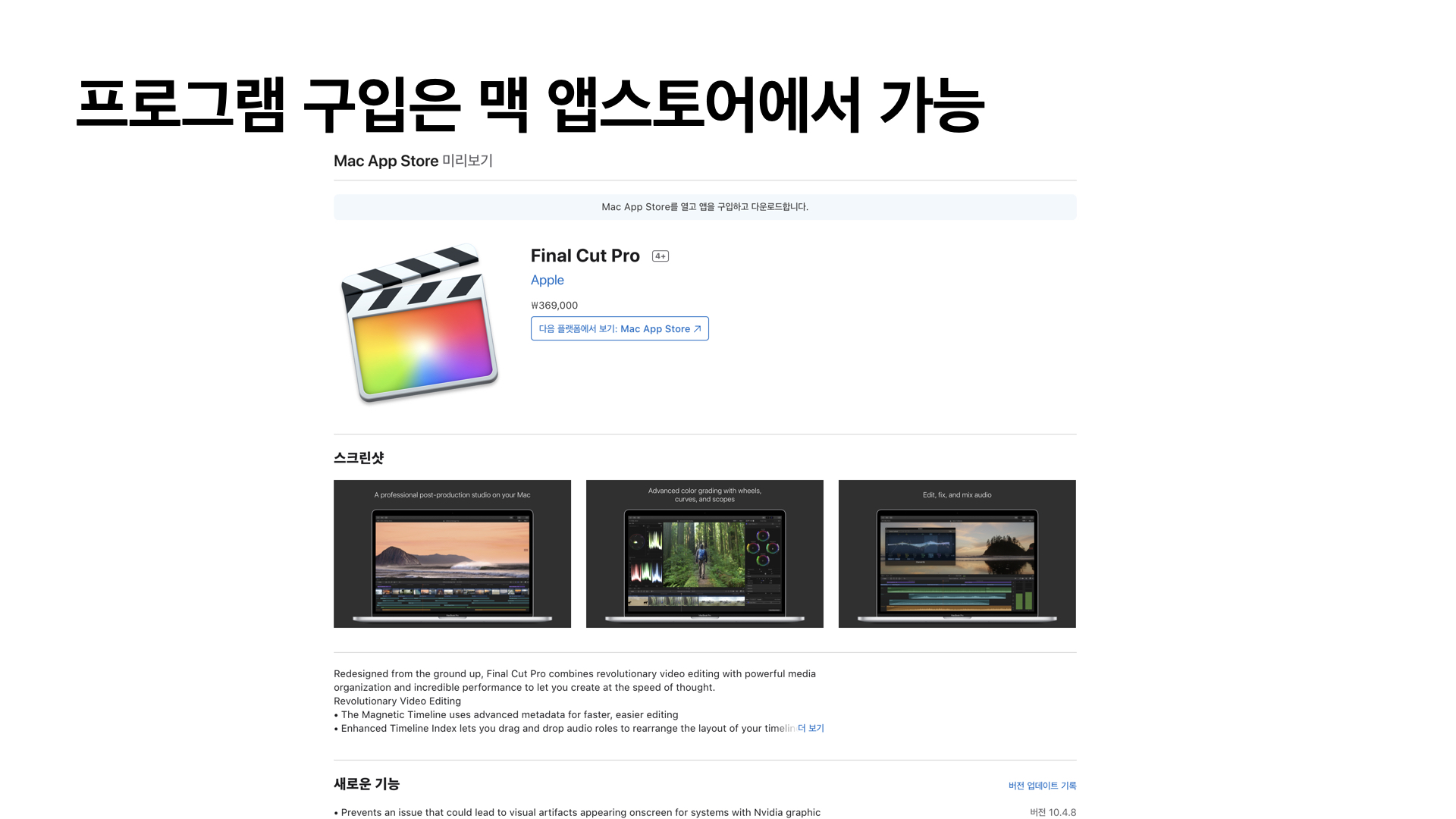 아이맥과 맥북에서만 설치되고 실행되는 이 프로그램의 특성상 맥을 구입해야만 파이널컷프로를 사용할 수 있습니다.