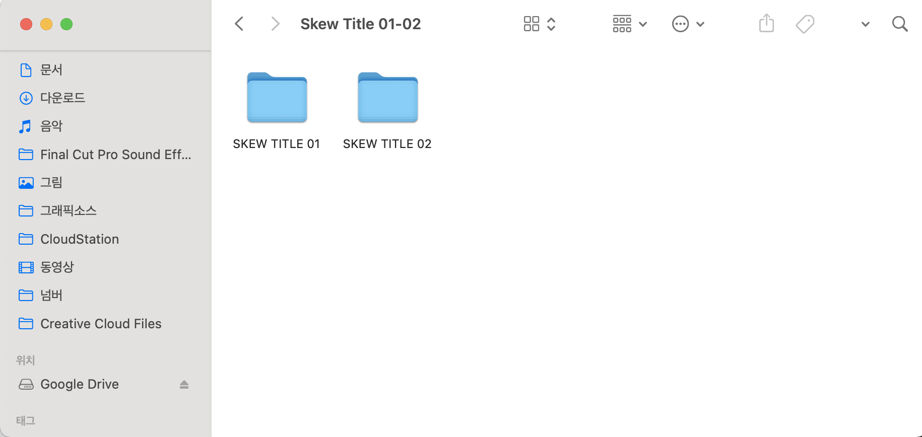 압축 파일을 다운로드한 후 압축을 풀고 난 후 [Skew Title 01]과 [Skew Title 02]를 파이널 컷 프로 템플릿 설치 경로에 넣어주시면 됩니다. (복사- 붙여 넣기)
