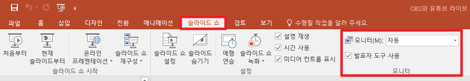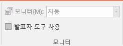 이 '발표자 도구'는 파워포인트를 실행 한 후 상단 메뉴 [슬라이드 쇼] - [모니터] 에서 설정할 수 있습니다.