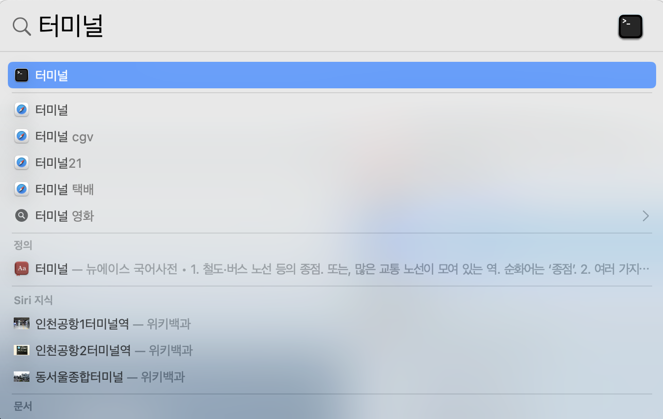 스포트라이트의 검색창에 '터미널' 이라고 입력을 해주면