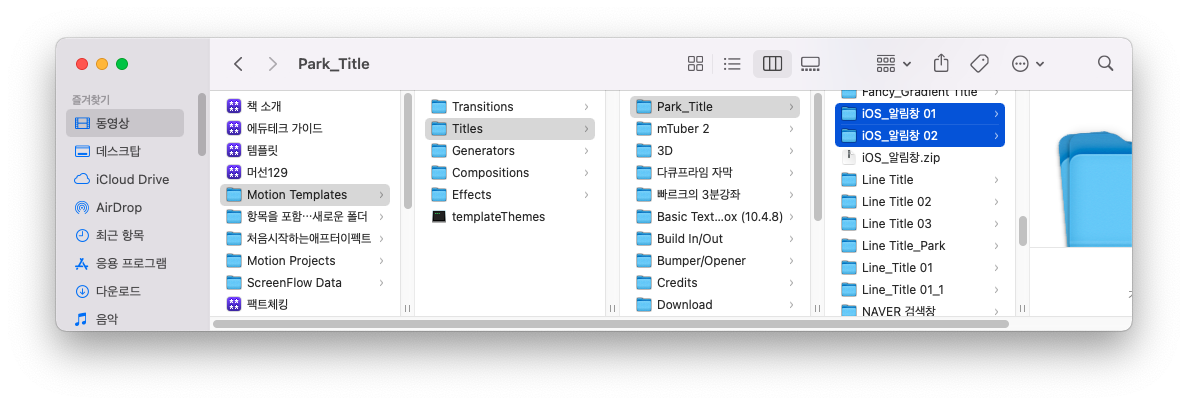 2. 템플릿 폴더로 이동: 압축을 푼 폴더 전체를 [동영상] > [Motion Templates] > [Titles] 폴더에 넣습니다. 이 위치에 넣어야 파이널컷프로에서 해당 템플릿을 인식할 수 있습니다.