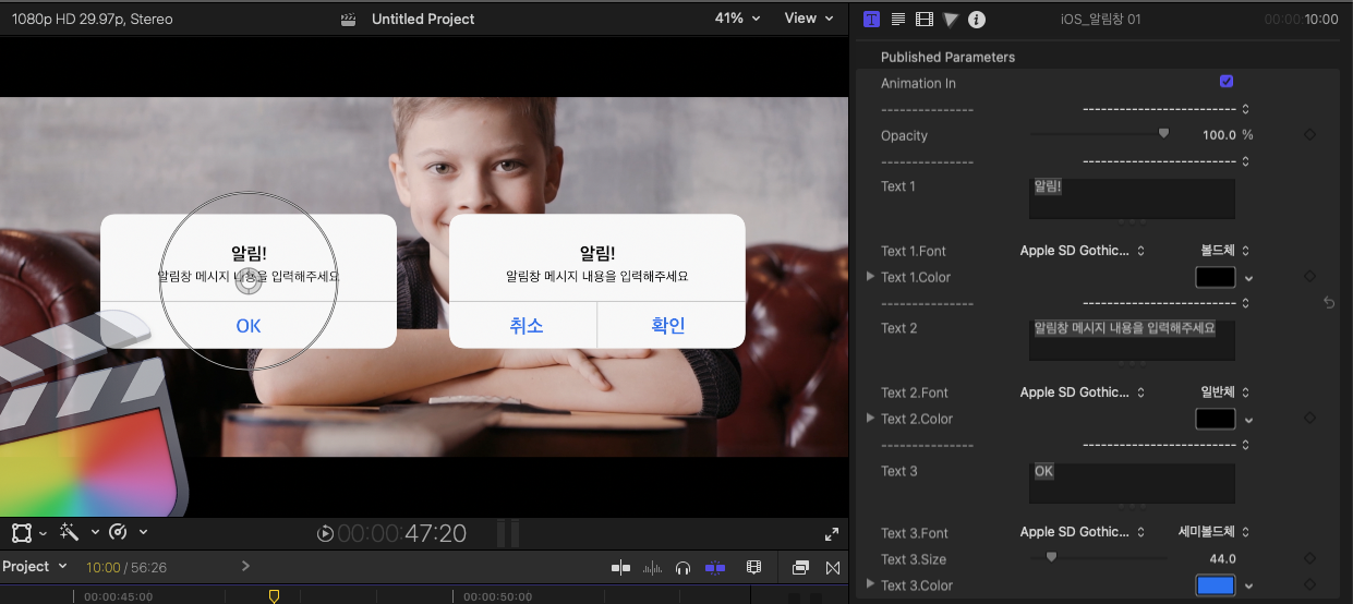 - 텍스트 수정: 템플릿이 타임라인에 추가된 후, 오른쪽 인스펙터(Inspector) 패널에서 텍스트 내용을 수정할 수 있습니다. 메시지의 내용을 원하는 대로 변경하고, 글꼴이나 색상도 조정할 수 있습니다.