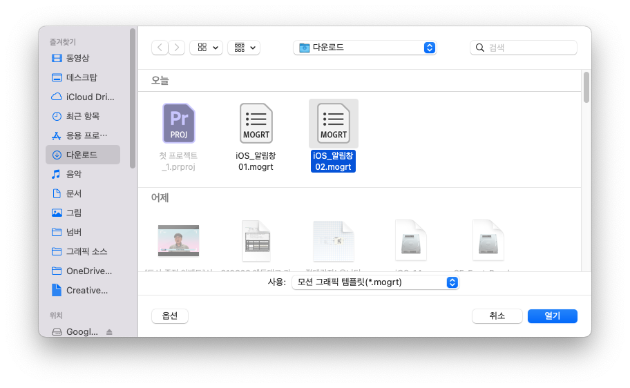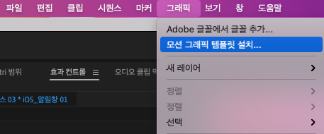 프리미어 프로 실행 후 모션그래픽 템플릿 설치를 이용해 다운로드 받은 mogrt 파일을 선택해주시면 설치가 끝납니다.