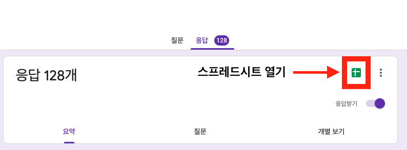 특히 '스프레드시트 열기' 버튼을 이용하면 설문 결과를 실시간으로 스프레드시트로 확인할 수 있습니다.