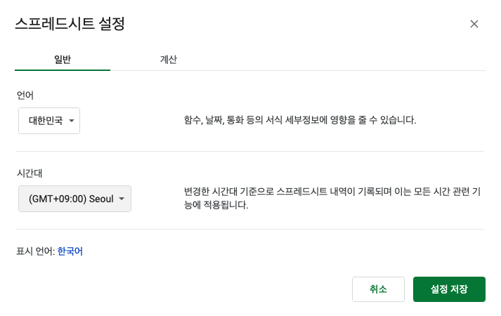 스프레드시트 설정의 일반 탭에서 언어와 시간대를 설정할 수 있습니다.