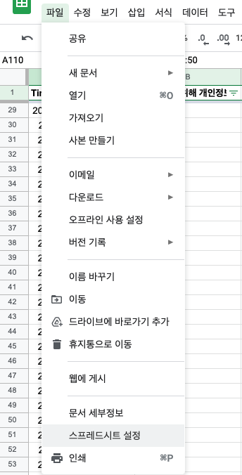 구글 스프레드시트의 [파일] 메뉴를 클릭하신 후