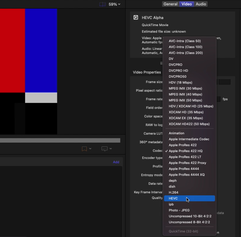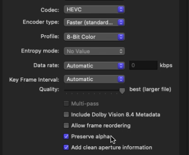 파이널 컷 프로와 모션5에서 영상을 출력할 때 HEVC 알파채널의 영상을 출력하기 위해서는