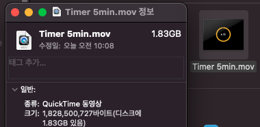 아래 그림을 보시면 5분 짜리 영상을 애플 ProRes4444 알파채널 포함하여 출력한 용량의 크기가 1.83기가 바이트 입니다.