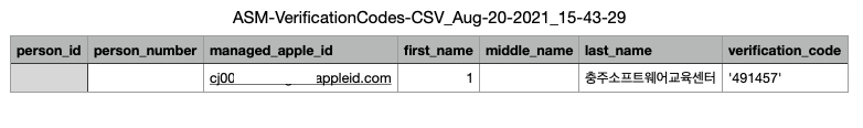 확인 코드는 애플 스쿨 매니저에서 계정을 클릭한 후 아래와 같은 메뉴에서 [확인 코드]를 눌러 생성할 수 있습니다.