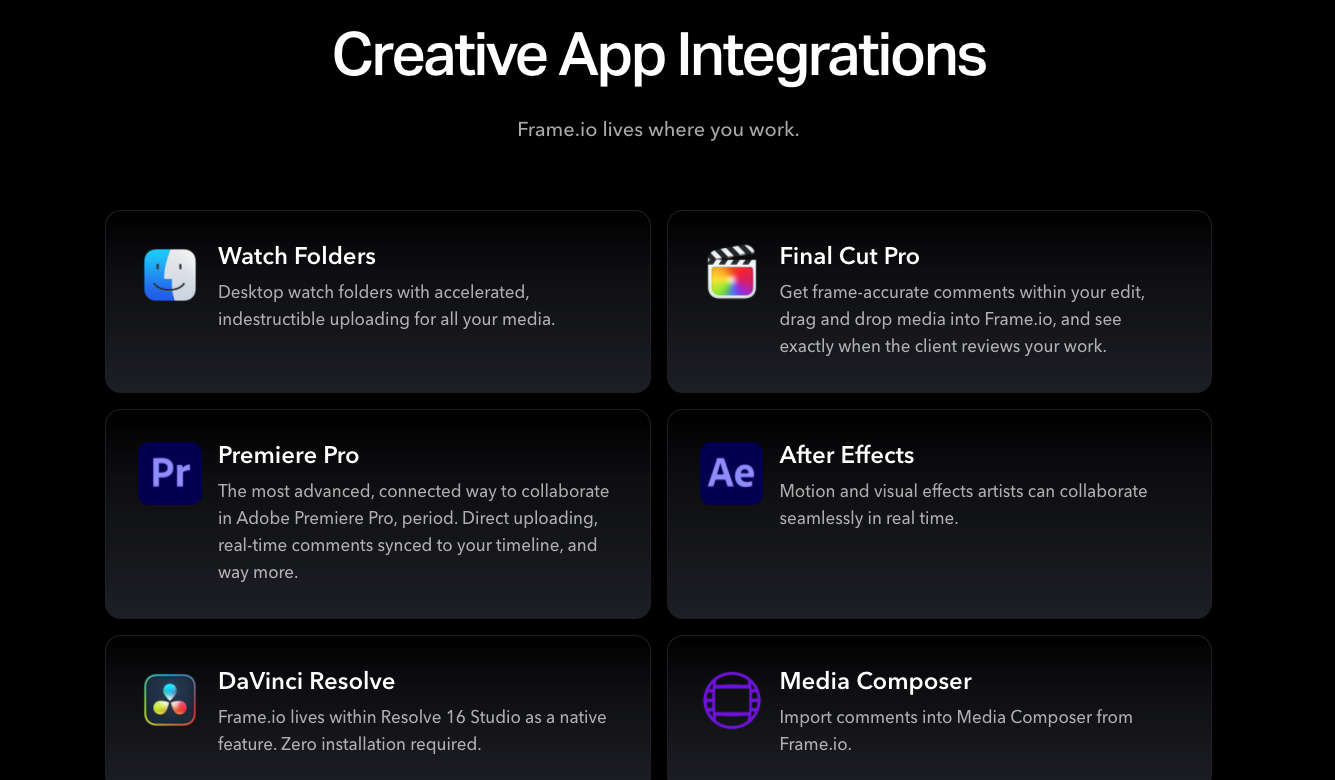 Frame.io를 적극적으로 통합하여 3rd 플러그인 형태의 기능으로 제공하기도 합니다.