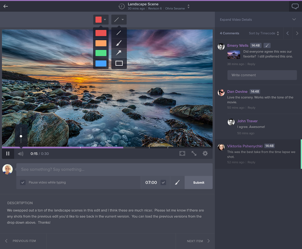 아래 영상 (약 30초 정도) 링크를 통해 frame.io의 기능을 간편하게 살펴볼 수 있습니다.