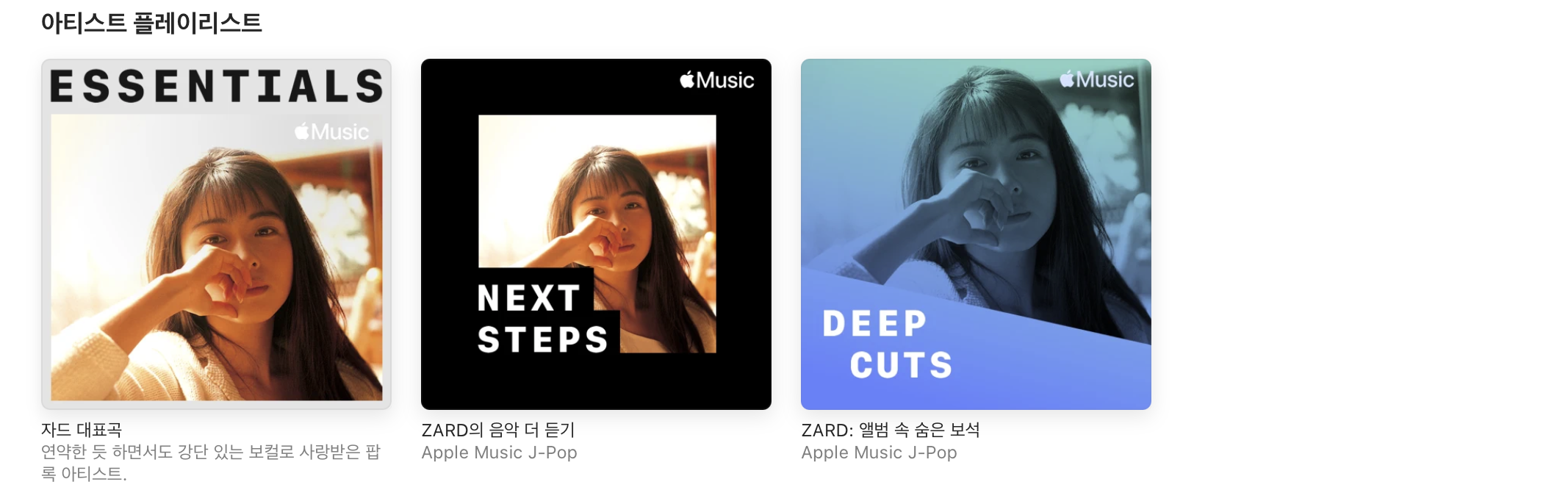 각 링크를 통해 애플 뮤직에서 제공되는 자드(ZARD)의 플레이리스트 곡들을 확인할 수 있습니다.