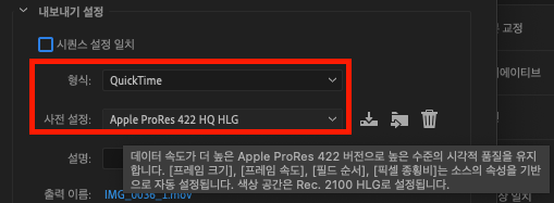 사전 설정을 'Apple ProRes 422 HQ HLG'로 출력하는 방법입니다.