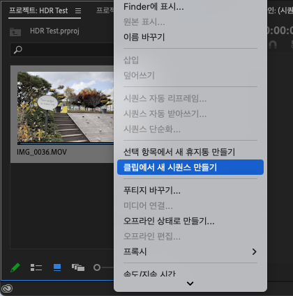 가져온 HDR 영상 클립을 마우스 우클릭 한 후 '클립에서 새 시퀀스 만들기'를 클릭합니다.