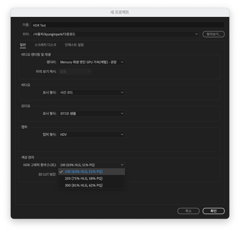 프로젝트의 이름을 설정합니다. 그리고 '색상 관리'에서 HDR 그래픽 흰색(니트)을 '100'으로 설정하겠습니다.