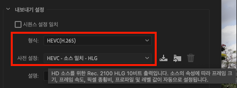 사전 설정을 'HEVC - 소스 일치- HLG'로 출력합니다.
