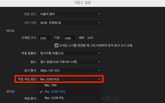 시퀀스의 색상 공간을 그림과 같이 Rec.2100-HLG로 설정합니다.