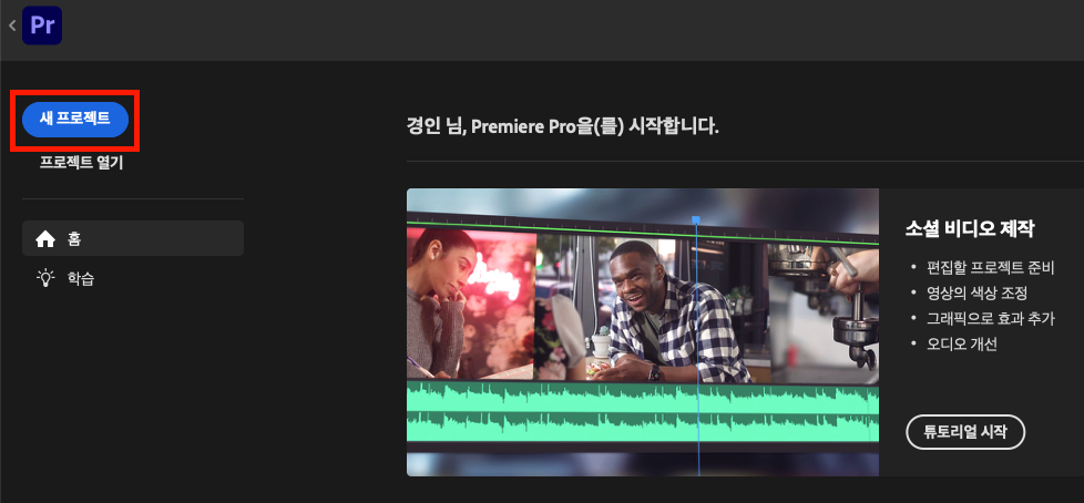 프리미어 프로를 실행한 후 프로젝트 브라우저에서 '새 프로젝트 만들기'를 클릭합니다.