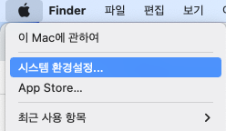상단 메뉴 '사과' 아이콘을 클릭한 후 '시스템 환경설정'을 클릭해봅시다.