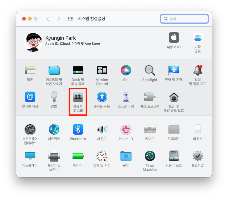 '시스템 환경설정'의 창이 열렸습니다. 많은 메뉴들이 있는데 그 중에서 '사용자 및 그룹'을 클릭합니다.