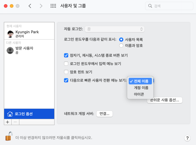 목록에서 '전체 이름'으로 선택하면 메뉴막대에 계정 이름(자신의 이름)이 나타납니다.