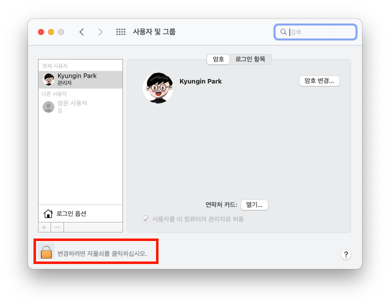 맥에서 왠만한 시스템 설정을 변경하기 위해선 맥OS 계정의 비밀번호를 입력해야 합니다.