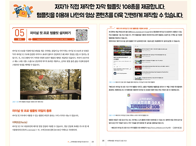 또한 저자가 직접 제작한 자막 템플릿 108종을 통해 나만의 영상 콘텐츠를 더욱 간편하게 제작할 수 있습니다.