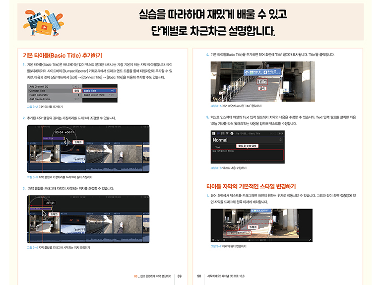 또한 실제 편집 과정에서 꼭 필요한 기능 그리고 작업 과정들을 자연스럽게 익힐 수 있습니다.