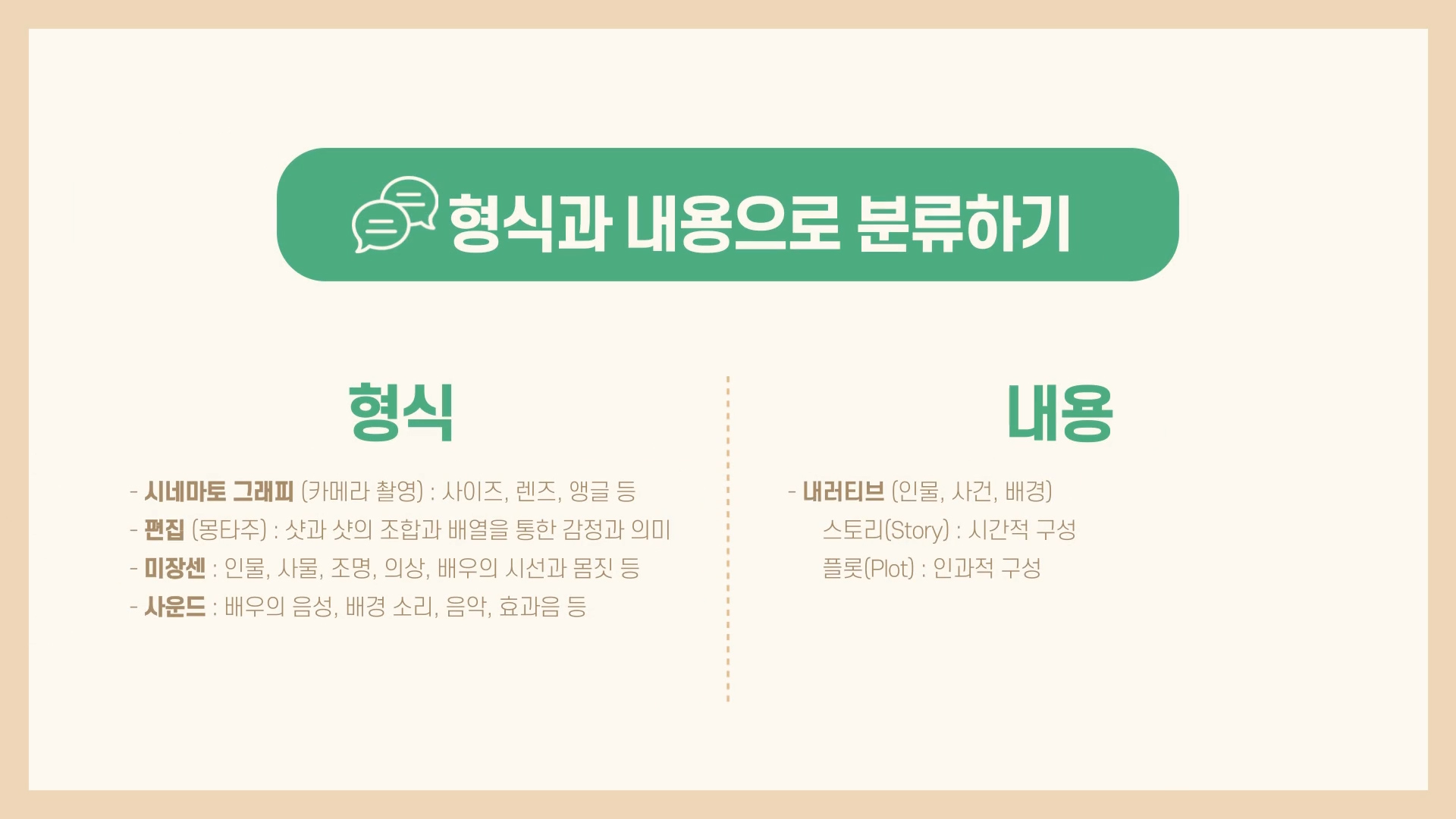 앞서 살펴본 5가지 범주는 크게 영화의 형식과 내용으로 살펴볼 수 있습니다.