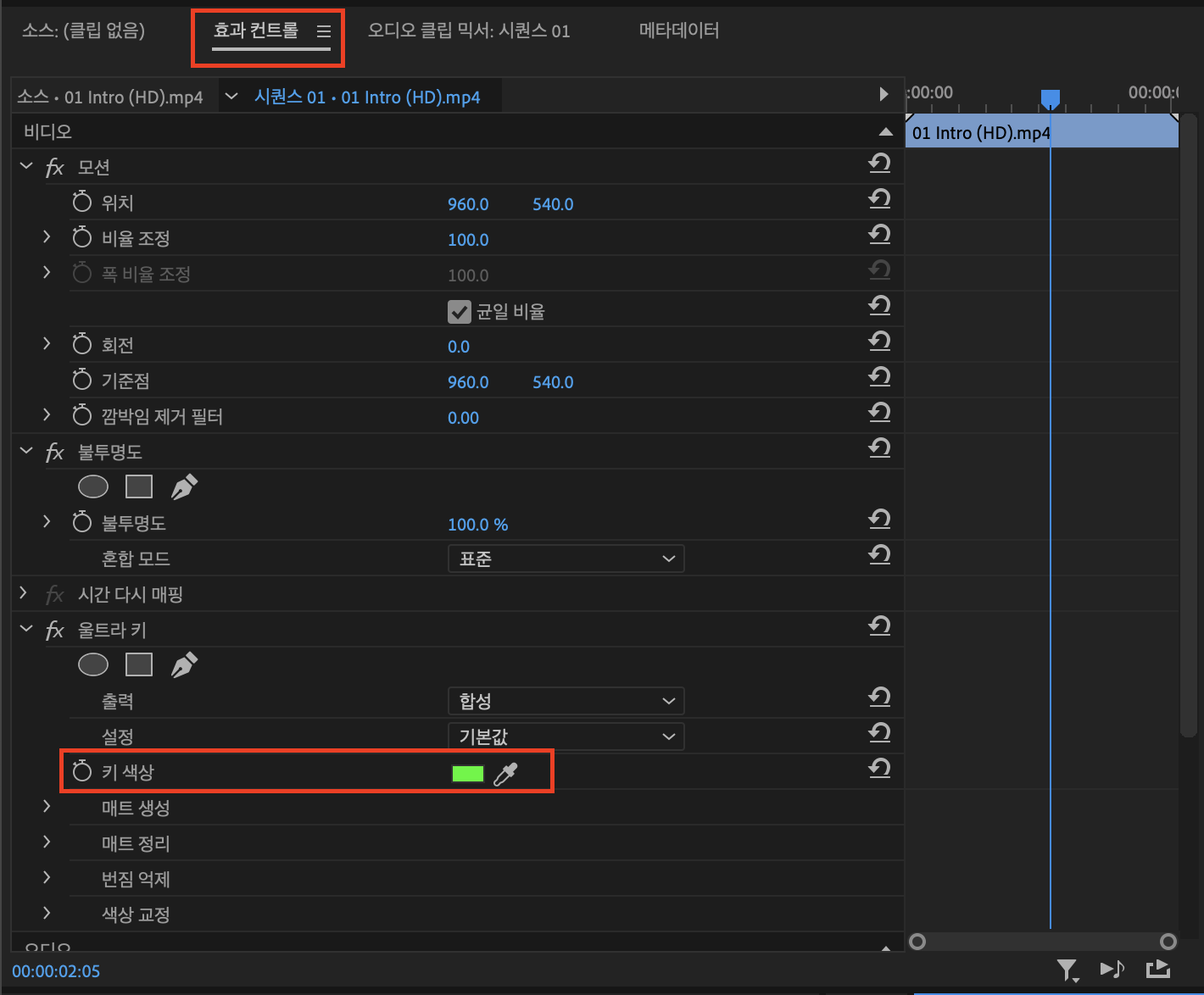 그리고 울트라 키를 적용한 클립을 선택한 후 [효과콘트롤]에서 울트라 키의 색상을 스포이드를 이용해 녹색으로 지정하면 됩니다.