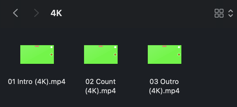 아이폰 영상촬영시 녹화 버튼을 누르기 전(01 Intro.mp4)과 누르고 난 후 촬영을 할 때의 모습(02 count.mp4) 그리고 다시 한 번 녹화 버튼을 눌렀을 때의 느낌(03 Outro.mp4)을 그린스크린 소스를 통해 표현할 수 있습니다.