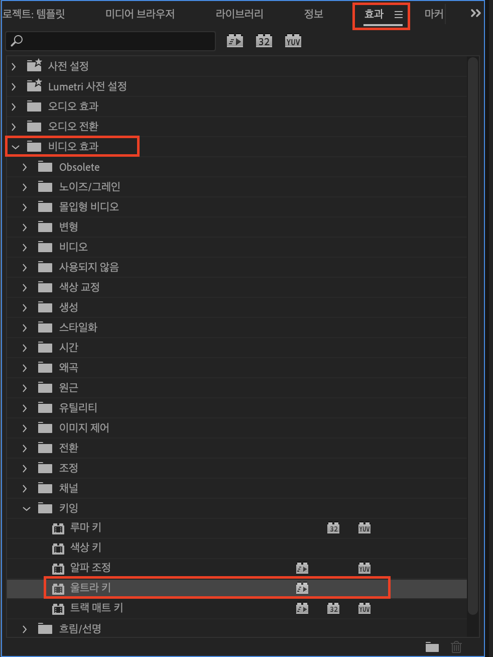 우선 프리미어프로의 경우는 [효과] - [비디오효과] - [키잉] - [울트라 키]를 그린스크린 클립에 적용합니다.