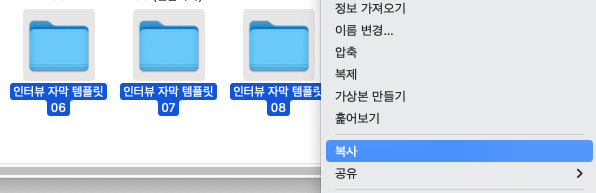 압축을 풀고 난 후 해당 폴더 (인터뷰 자막 템플릿 06, 인터뷰 자막 템플릿 07, 인터뷰 자막 템플릿 08)를 복사하신 후