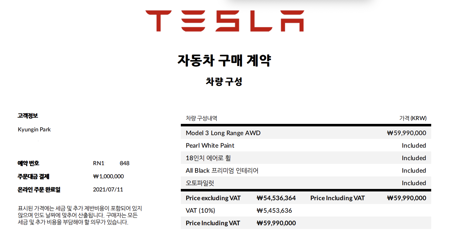 저의 경우를 예로 들어 테슬라 모델 3 차량 계약부터 인도까지의 과정을 총정리해보겠습니다.