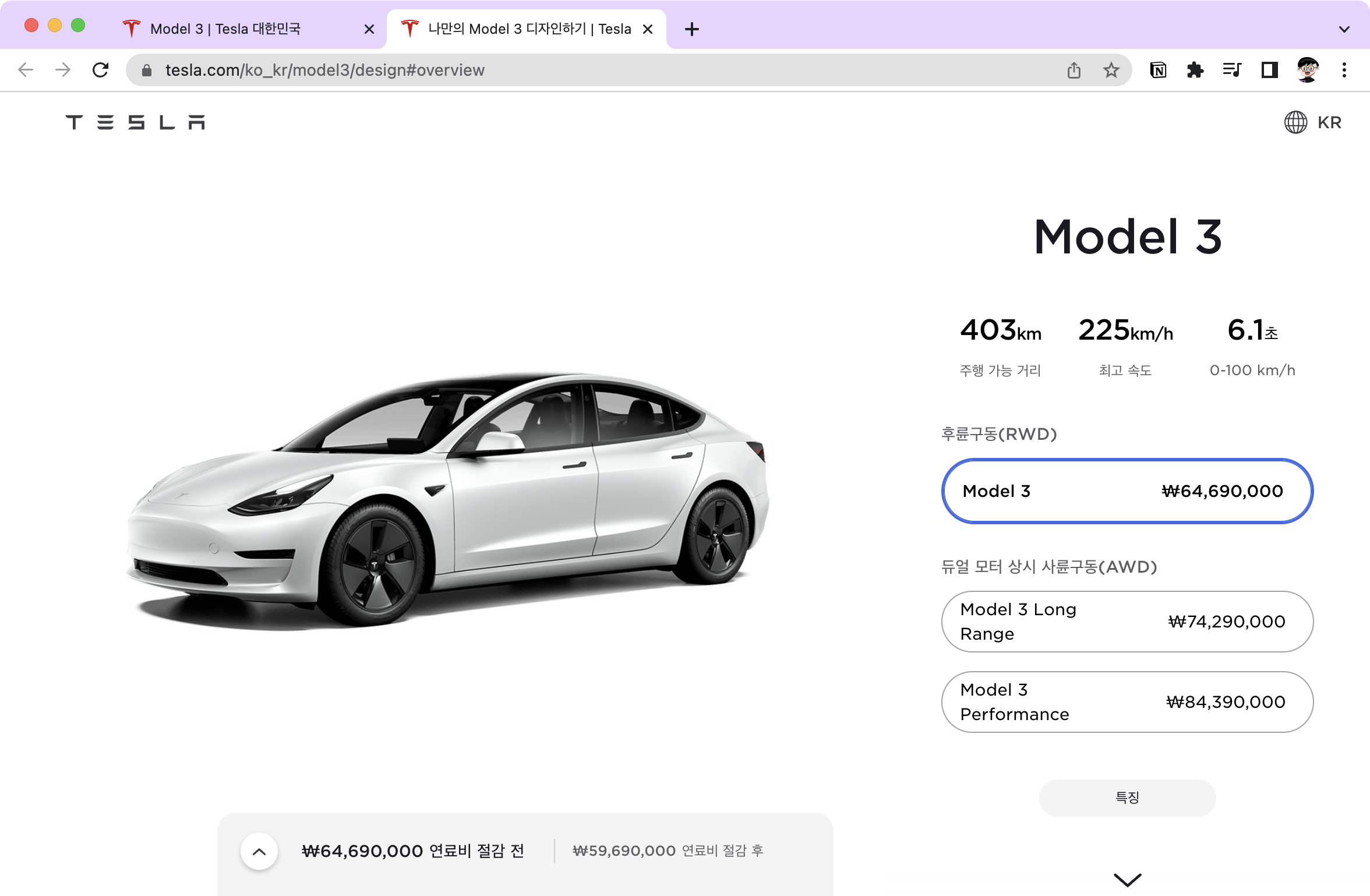 제가 계약했던 2021년 7월에는 롱레인지 모델이 59,990,000원이었습니다.