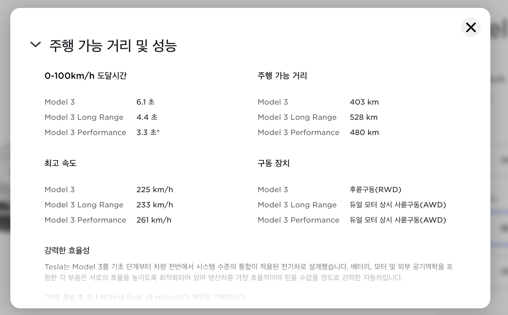 각 트림마다 제로백(0에서 100km/h까지 도달 시간) , 주행 가능 거리, 최고 속도, 구동 장치 등의 차이점이 있습니다.