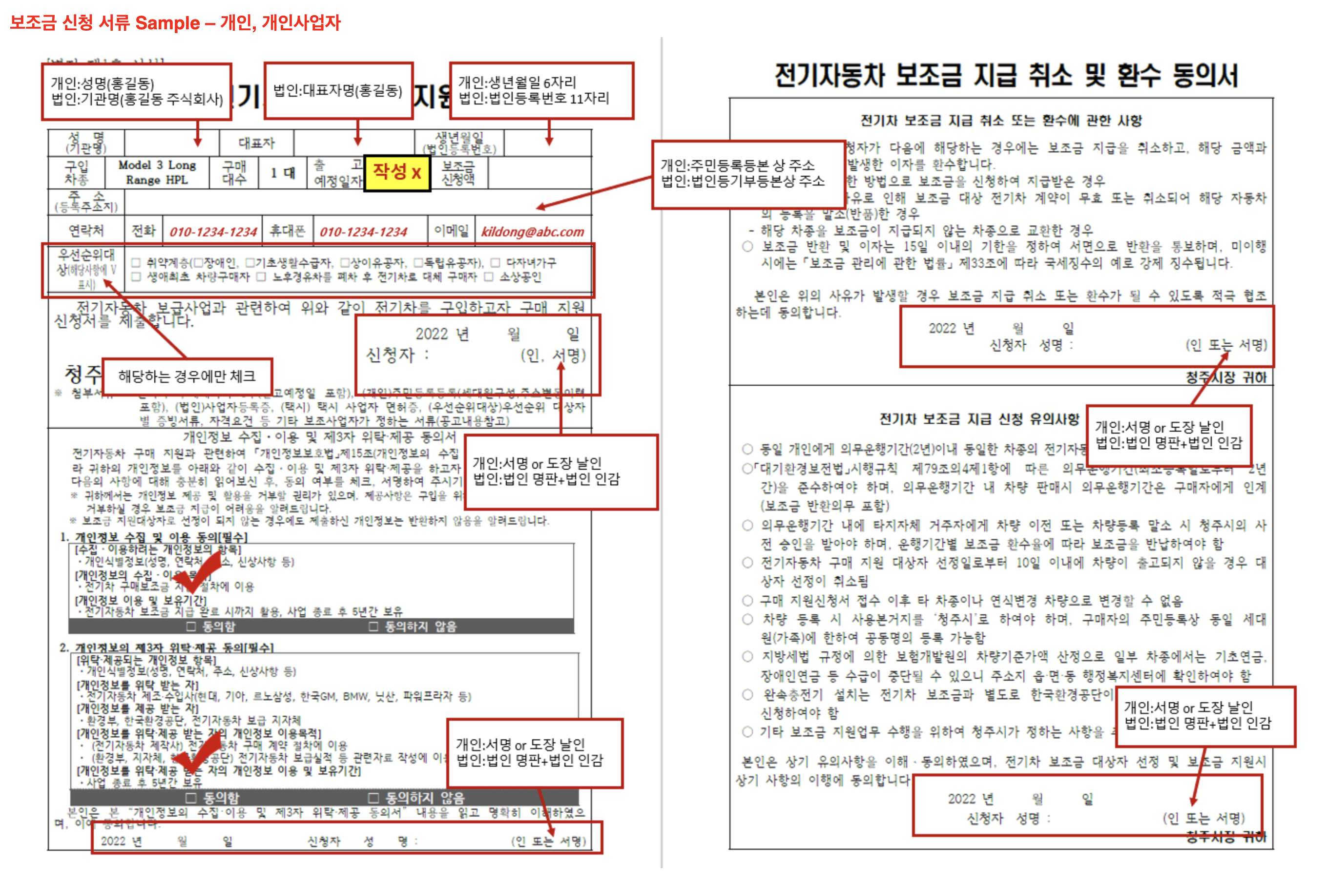 청주시를 기준으로 한 전기자동차 구매 지원 신청서(테슬라 모델3)의 작성 방법은 다음 그림과 같습니다.
